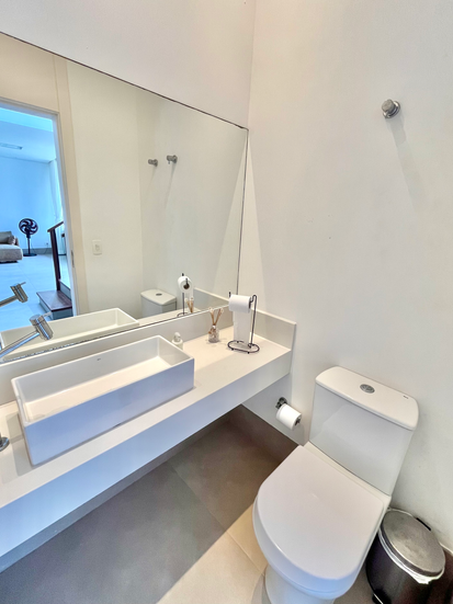 Além disso, o terceiro andar dispõe de um mezanino completo, com banheiro e cozinha própria, funcionando praticamente como uma casa de hóspedes. Na varanda, uma hidromassagem convida ao relaxamento, com uma vista deslumbrante para o mar.