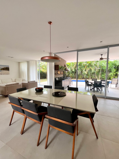 No primeiro andar, os ambientes são integrados, proporcionando amplitude e conforto: sala de estar, sala de TV e sala de jantar compõem o espaço, junto à cozinha, que é totalmente equipada e conta com uma bela decoração.
