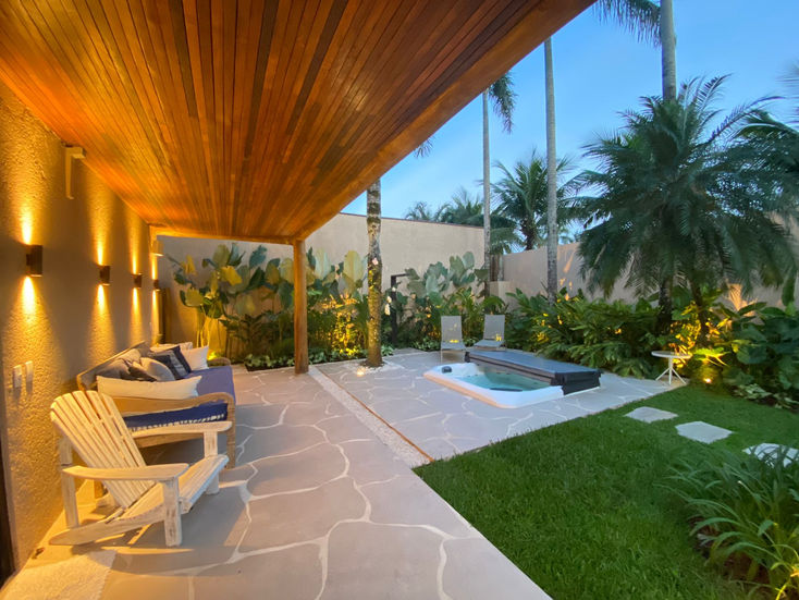 A casa dispõe de 4 suítes com ar-condicionado, sala de estar com TV a cabo, piscina e jacuzzi privativas, varanda com churrasqueira, jardim interno, 2 geladeiras/freezer, acesso à internet, garagem para até 2 carros e lavanderia.