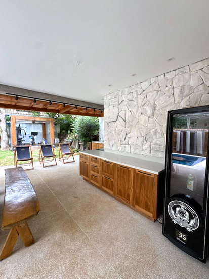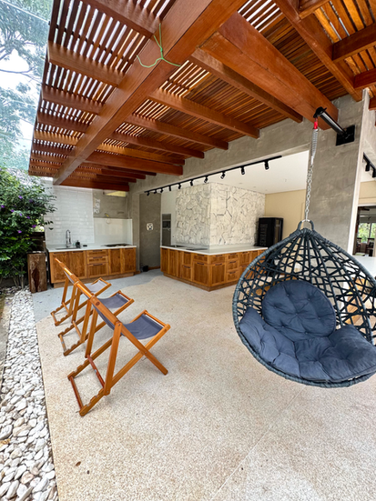 A cozinha é super completa: airfryer, filtro d’água, duas geladeiras, cafeteira, utensílios e tudo que você precisa para cozinhar sem perrengue.