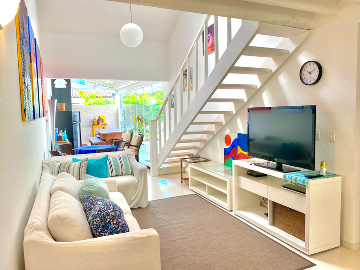 Imóvel localizado em condomínio fechado na avenida principal da praia. Bem equipada e decorada com estilo agradável, a casa acomoda até 8 pessoas. Possui 3 quartos e 3 banheiros, cozinha americana e quintal com churrasqueira.