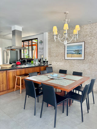 A cozinha está integrada à sala de jantar e sala de estar. Além de uma bela vista para a área externa da casa.