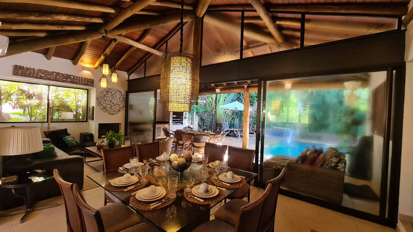 A casa conta com 4 suítes, cozinha, sala de estar, duas salas de TV, piscina aquecida e churrasqueira.