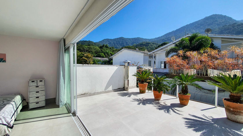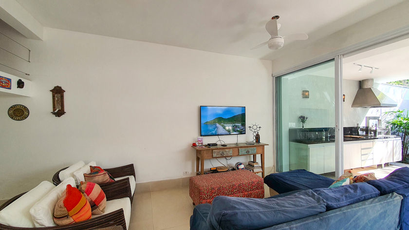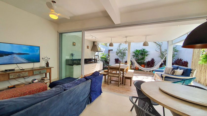 Casa com 5 quartos, 6 banheiros, cozinha americana, sala com Wifi e TV e área externa com churrasqueira.