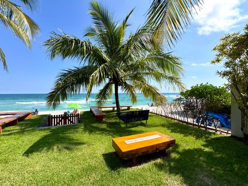 A área externa é um convite permanente ao descanso, com piscina privativa, gramado, espaços de convivência, churrasqueira e o privilégio de estar literalmente a poucos passos do mar.
