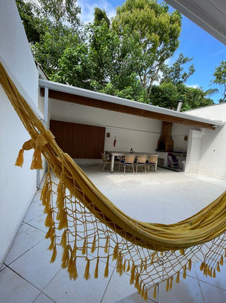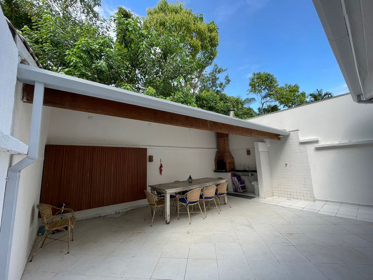 No andar térreo a casa conta com uma sala de estar com TV, sala de jantar, lavabo, churrasqueira, mesa e cadeira externa.
