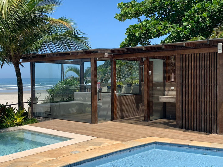 A casa oferece uma área externa com churrasqueira e uma vista incrível da praia, além de 5 suítes aconchegantes, sendo: