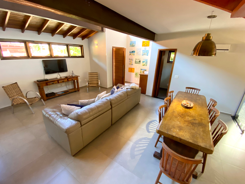 A casa possui uma área gourmet com churrasqueira, ambientes integrados, sala ampla, cozinha equipada, dois lavabos (um dentro da sala e um na área gourmet) duas duchas e área de serviço com máquina de lavar.