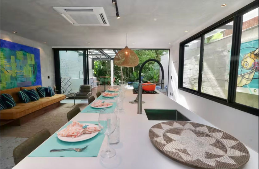 O imóvel conta com 5 suítes e acomoda até 12 hóspedes, com espaços bem distribuídos. A casa fornece roupa de cama e banho, possui filtro de água, voltagem 110V e é pet friendly, permitindo até 2 pets.